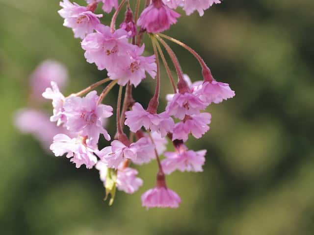 The Prunus Shidare sakura Cheals Weeping Cherry is a beautiful tree with branches that are pendulous, meaning they hang down from the main trunk, and are grafted onto standing trunks. This gives the tree a very unique and stylish look. The young leaves of the Prunus Shidare sakura Cheals Weeping Cherry are reddish bronze in color, but they turn green when they mature. The autumn foliage of this tree is absolutely stunning, with shades of yellow, orange, and scarlet. But the real showstopper of the Prunus Shidare sakura Cheals Weeping Cherry is its gorgeous double rosy pink blossoms that form in large clusters in mid spring. This tree is sure to make a statement in any home or garden.