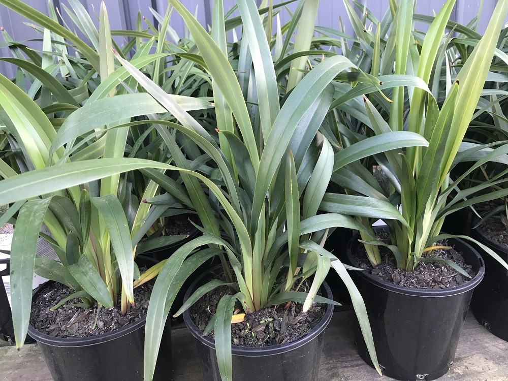 Dianella Tasred will often get a red base in cold climates, or even change from green to green with reddish tinges at times. This hardy shrub has a dense tidy appearance with beautiful wide leaves and large purple berries in spring and summer.