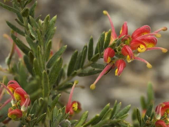 Grevillea Fireworks is a small to medium shrub, with bright red and yellow flowers, and soft grey/green foliage. Flowers occur on the end of short branches, and an explosion of colour is seen from autumn to spring. Plants are both frost and drought tolerant and are useful for attracting birds to your garden.