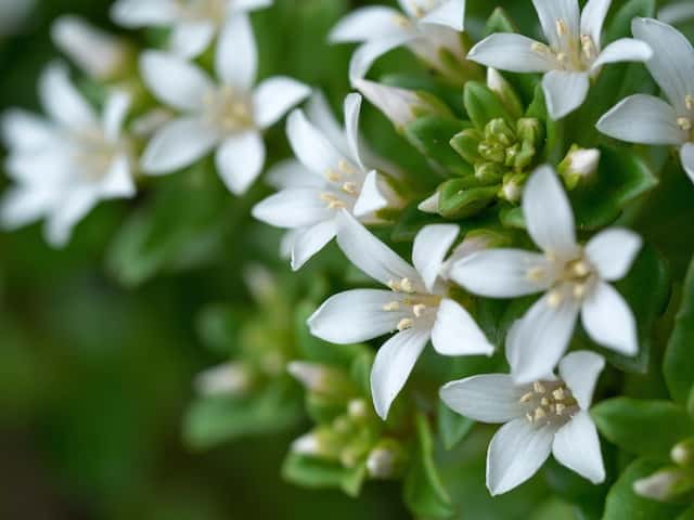 Long-leaf Waxflower is a rounded, evergreen bush with aromatic, leathery leaves. In spring the shrub is almost completely covered with white, waxy, star-like flowers, which open from pink buds